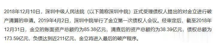 经审定,截至2018年12月31日,金立的账面资产总额约为85.38亿元,清查后的资产总额约为38.39亿元,债权总额为173.59亿元,负债达到近211亿元。